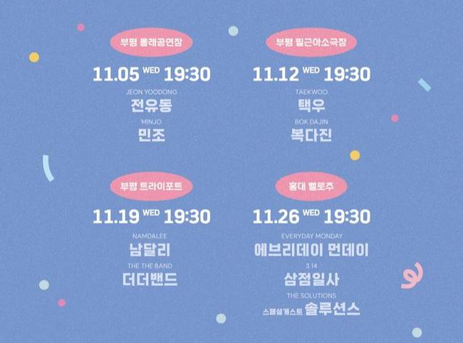 부평구(구청장 차준택) 문화재단 문화도시센터는 오는 11월 매주 수요일 오후 7시 30분 지역 뮤지션들의 공연 `MUSIC EVERYWHERE 부평`을 총 4회에 걸쳐 진행한다고 밝혔다.