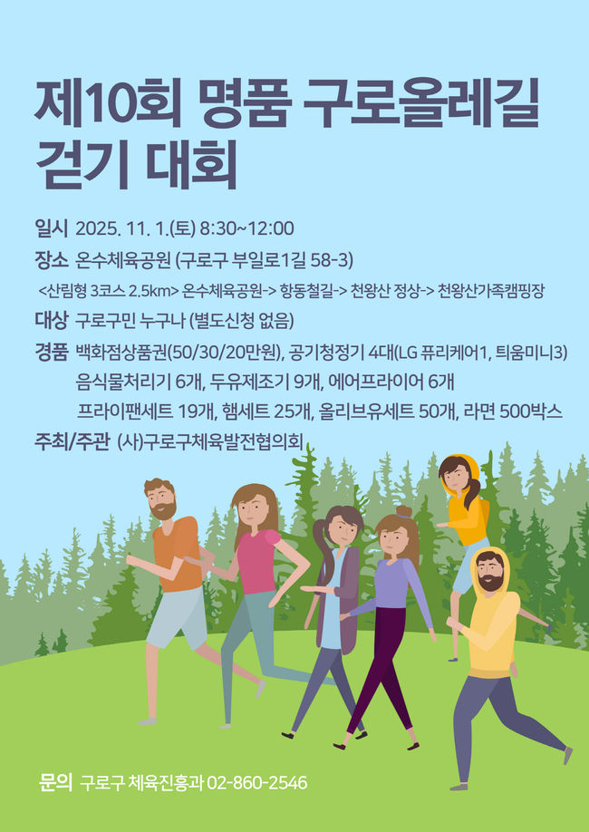 제10회 명품 구로올레길 걷기 대회 홍보 포스터.사단법인 구로구체육발전협의회(회장 김홍수)가 주최·주관하고 구로구(구청장 장인홍)가 후원하는 ‘제10회 명품 구로올레길 걷기 대회’가 오는 11월 1일 오전 8시 30분 온수체육공원에서 열린다.