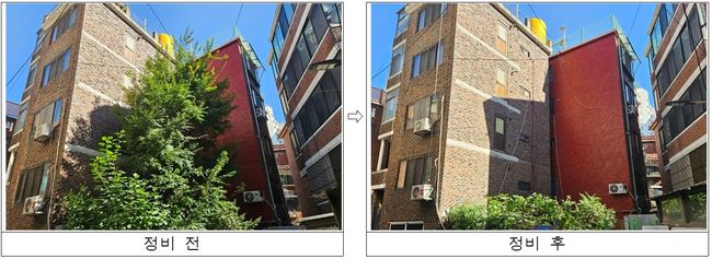 구로구 주택가 내 위험수목 정비 전후 모습.1일 구로구(구청장 장인홍)는 ‘2025년 하반기 위험수목 처리 지원사업’을 완료하며 생활권 안전 강화에 나섰다고 밝혔다.