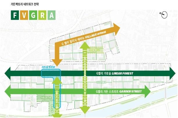 G밸리 가든팩토리의 총면적은 187,364㎡로, 공개공지 135개소, 가로수 2,227주, 띠녹지 4,527㎡ 등을 포함해 연속적인 녹지축을 형성하는데 중점을 두고 있다. G밸리 내 다양한 녹지공간을 단순히 잇는 것이 아니라 미세먼지와 도로변 소음을 차단할 수 있는 `녹지축`을 형성하는 데에도 주력한다.